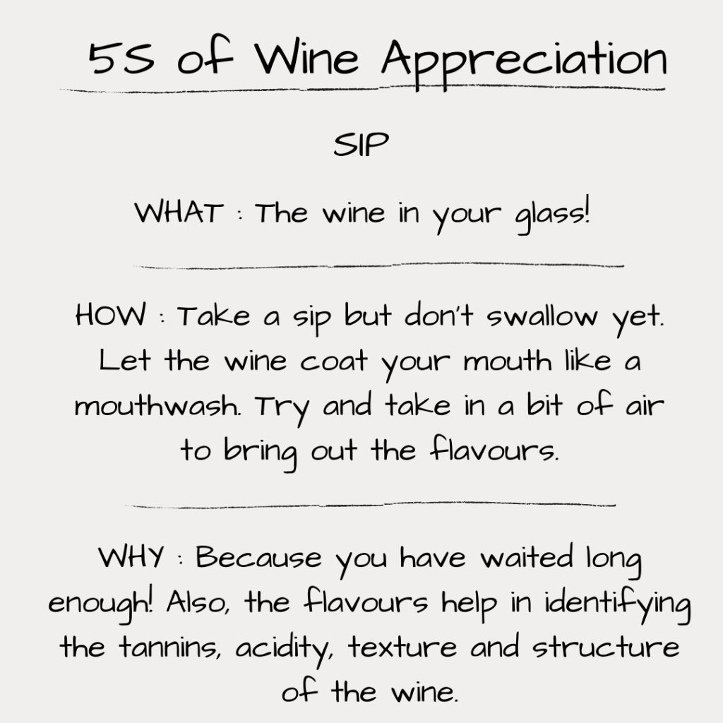 While we may want to enjoy only one ‘S’ in wine tasting – sipping, there are 4 more ‘S’s we need to explore to truly appreciate a wine.