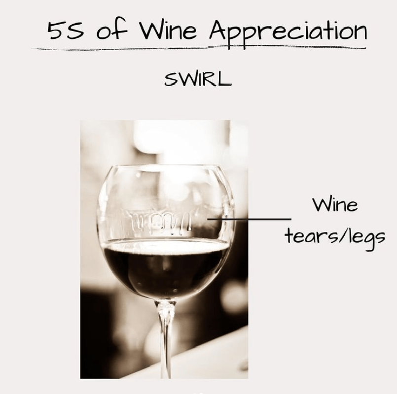 Swirling also helps to coat the glass with the wine so that the legs/tears appear. The tears are indicative of the viscosity, alcohol, sweetness and sometimes the tannins of the wine.