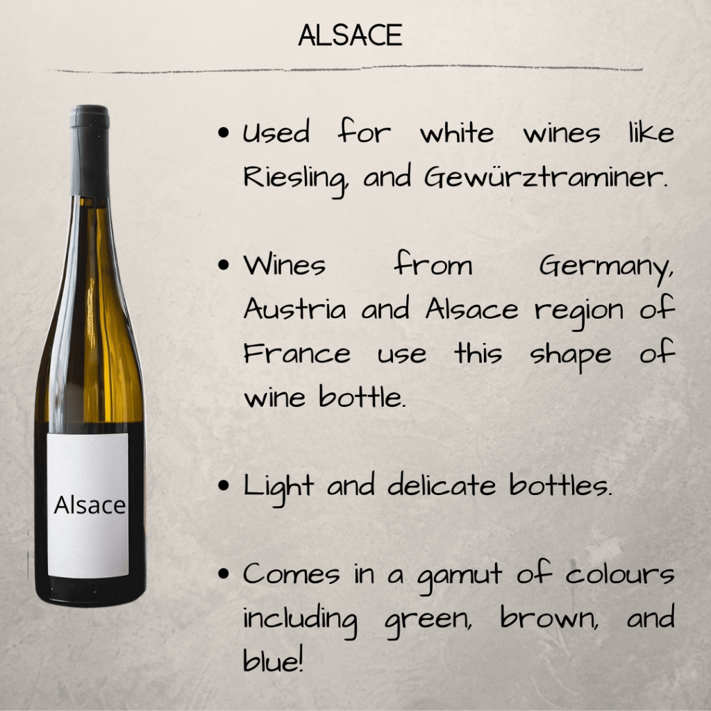 Today, any bottle shape can be used to store any wine depending on the winery’s or winemaker’s choice but in France, due to their appellation rule, certain bottle shapes can only be used for a specific wine. These regions also lend their names to those particular shapes of the bottle.