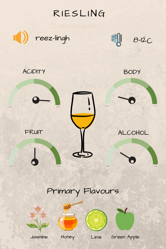 Primary flavours of Riesling include jasmine, frangipani, apricot, apple and lime. Usually made as a single varietal wine, it is not uncommon to find it in blends.Riesling is also one of the few white wines that age really well and an aged Riesling has a distinct petroleum note.